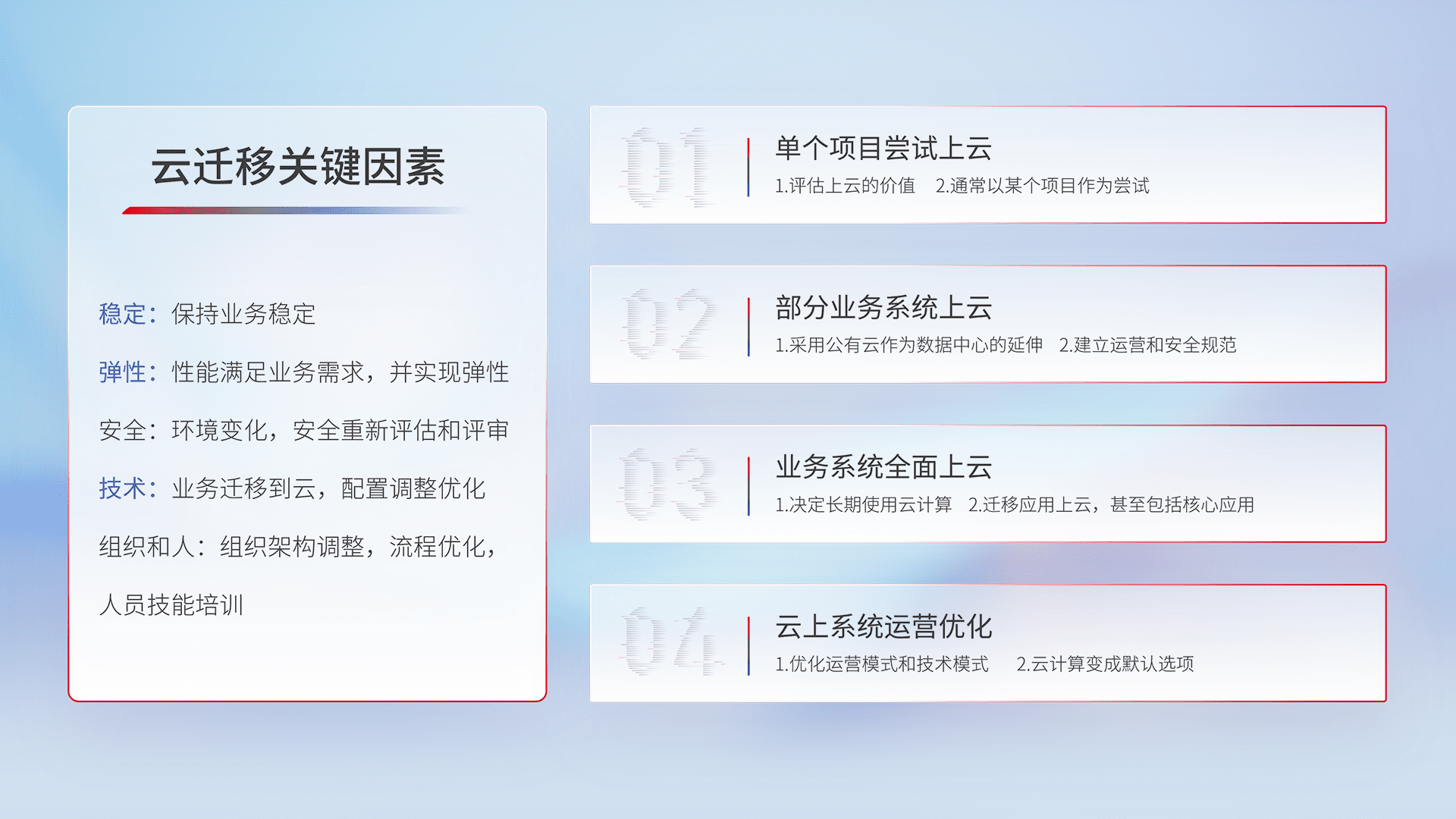 结合实际业务,,,,从规划设计、、、、云平台选型、、、云原生改造、、、数据迁移、、、、集成交付,,,迁移全过程为客户识别最佳上云路径,,,,做好风险识别管理,,,,设计网络架构、、、、身份权限、、、、安全审计合规、、操作审计、、、、日志审计、、、监控告警策略、、、多站点容灾设计等,,对云上基础设施进行整体规划,,,提升IT治理水平,,,,以满足弹性、、、、高可用、、、、高性能的需求。。