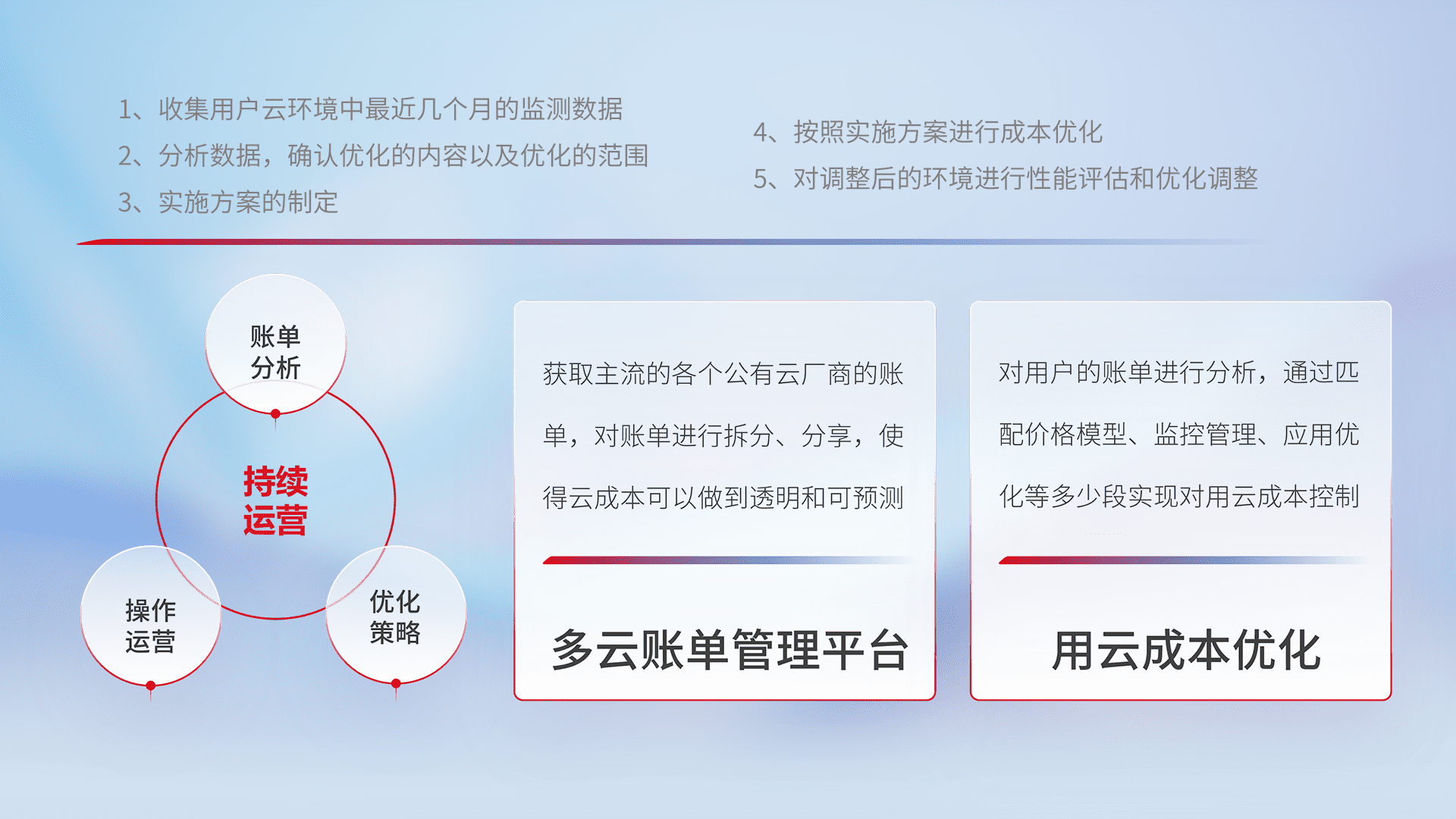通过多云纳管,,以统一的资源数据模型把客户的云资源进行抽象和封装,,,进而实现对多云资源的统一操作,,,保障云资源管理的可靠性、、、、稳定性与可用性。。。。量身定制化运维内容,,,,配置、、开发运维、、补丁管理、、、、备份、、、、监控、、认证和访问管理、、、、审计和日常巡检等,,,,保障在用云过程中的可靠度,,,稳定度以及高可用率。。。